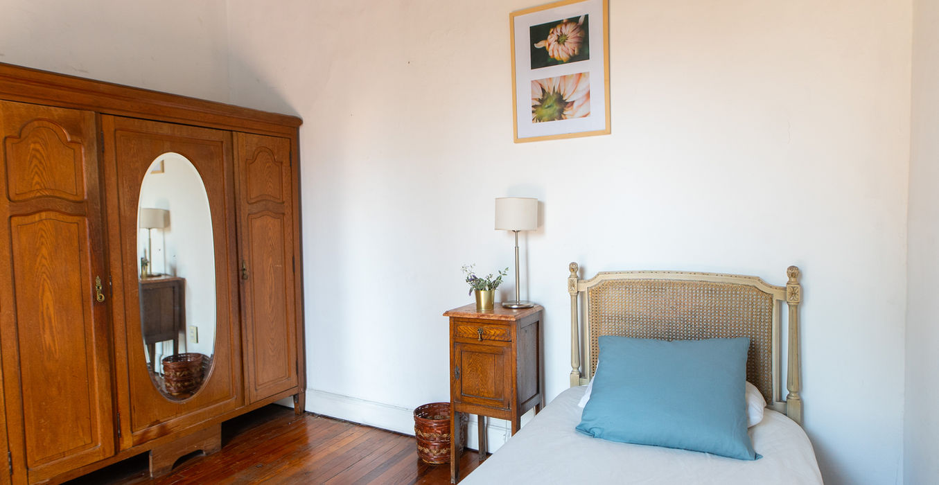 Surrounded by the garden, this bedroom features a window door opening onto it and a second window offering views rich with plants, trees, and flowers. Original wooden floors and a high ceiling lend the room a calm atmosphere, while a separate walking closet completes the space—an intimate haven open to light and greenery.